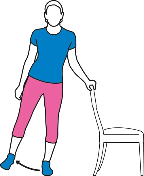Pomerite nogu unazad, držeći koleno ravnim. Čvrsto stisnite zadnjicu i zadržite pet sekundi. Ne naginjite se napred. Ponovite sa drugom nogom. Držite se za stolicu ili radnu površinu za podršku.
