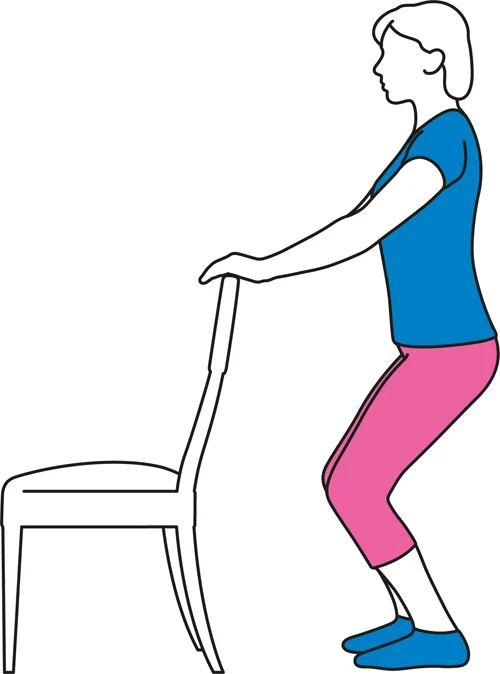 Držite se za stolicu ili radnu površinu za podršku. Čučnite dok vam koleno ne bude direktno iznad nožnog prsta. Kolena ne bi trebalo da idu ispred nožnih prstiju. Vratite se u svoj normalan stojeći položaj. Ponavljajte sve dok više ne možete, odmorite se jedan minut, a zatim ponovite još dva puta. Kako napredujete, pokušajte da čučnete malo dalje, ali ne savijajte kolena iznad pravog ugla.